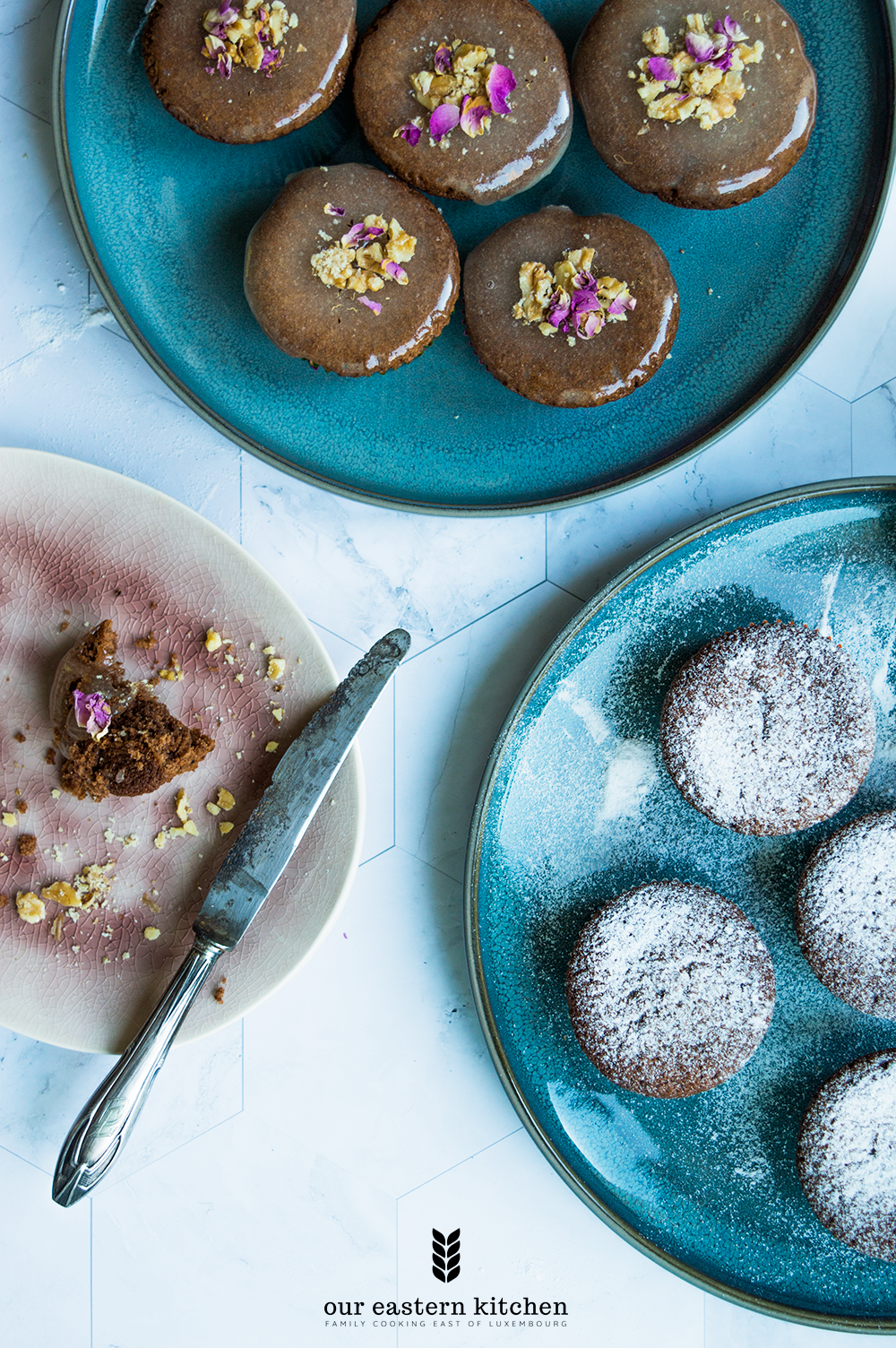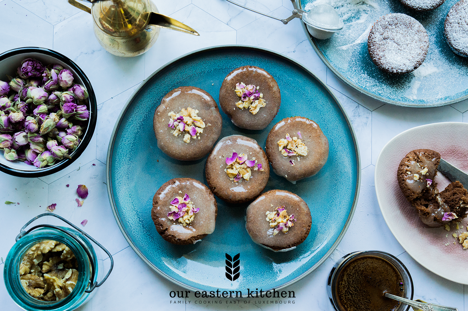Most Delicate Chocolate Cupcakes with Lemon Glaze, Rose Petals and Walnuts