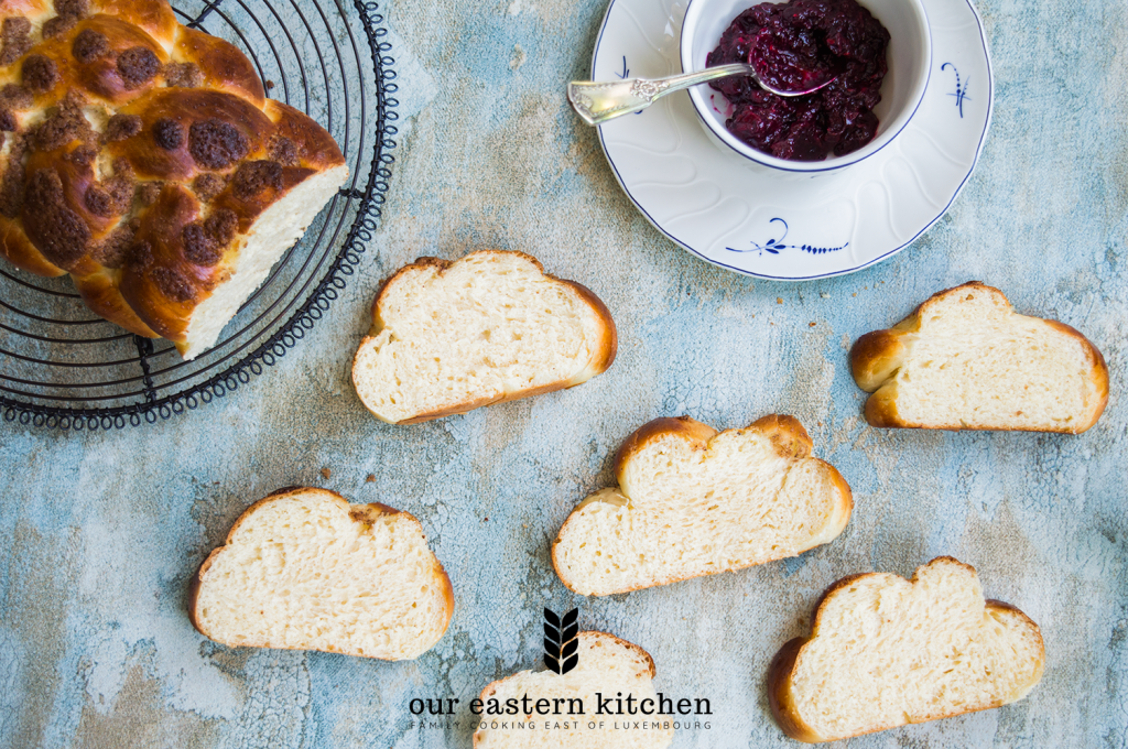 If you decide to make your challah less sweet, you can also top is with poppyseeds or sesame seeds, instead the sweet crumble.