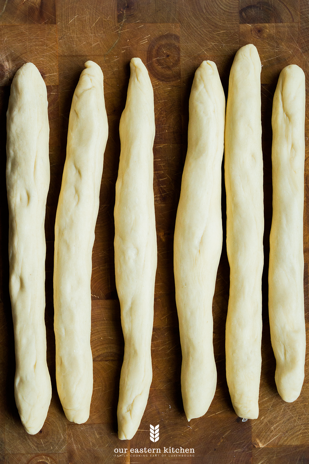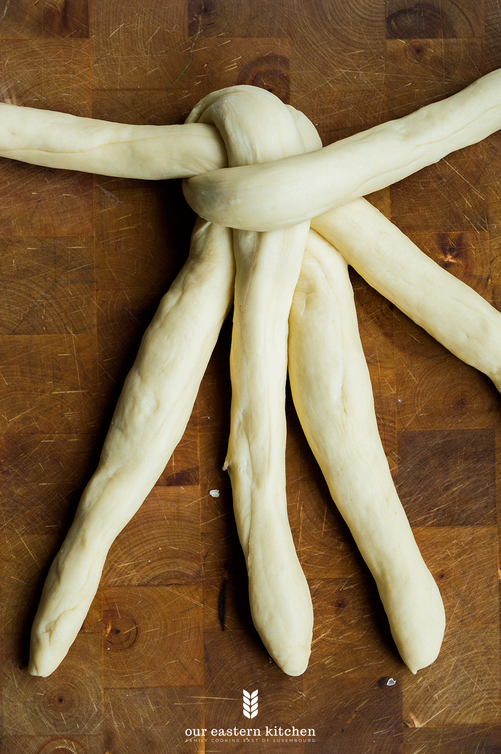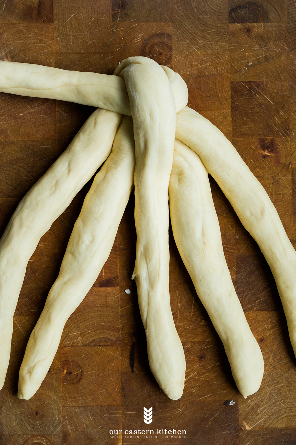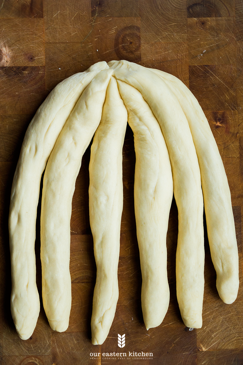 After the dough has doubled its size, take it out on a worktop and knead for few seconds. Split it in two, cover one half with a tea towel and spilt the other one into six equal parts. Roll out each part to form 6 equal strands.