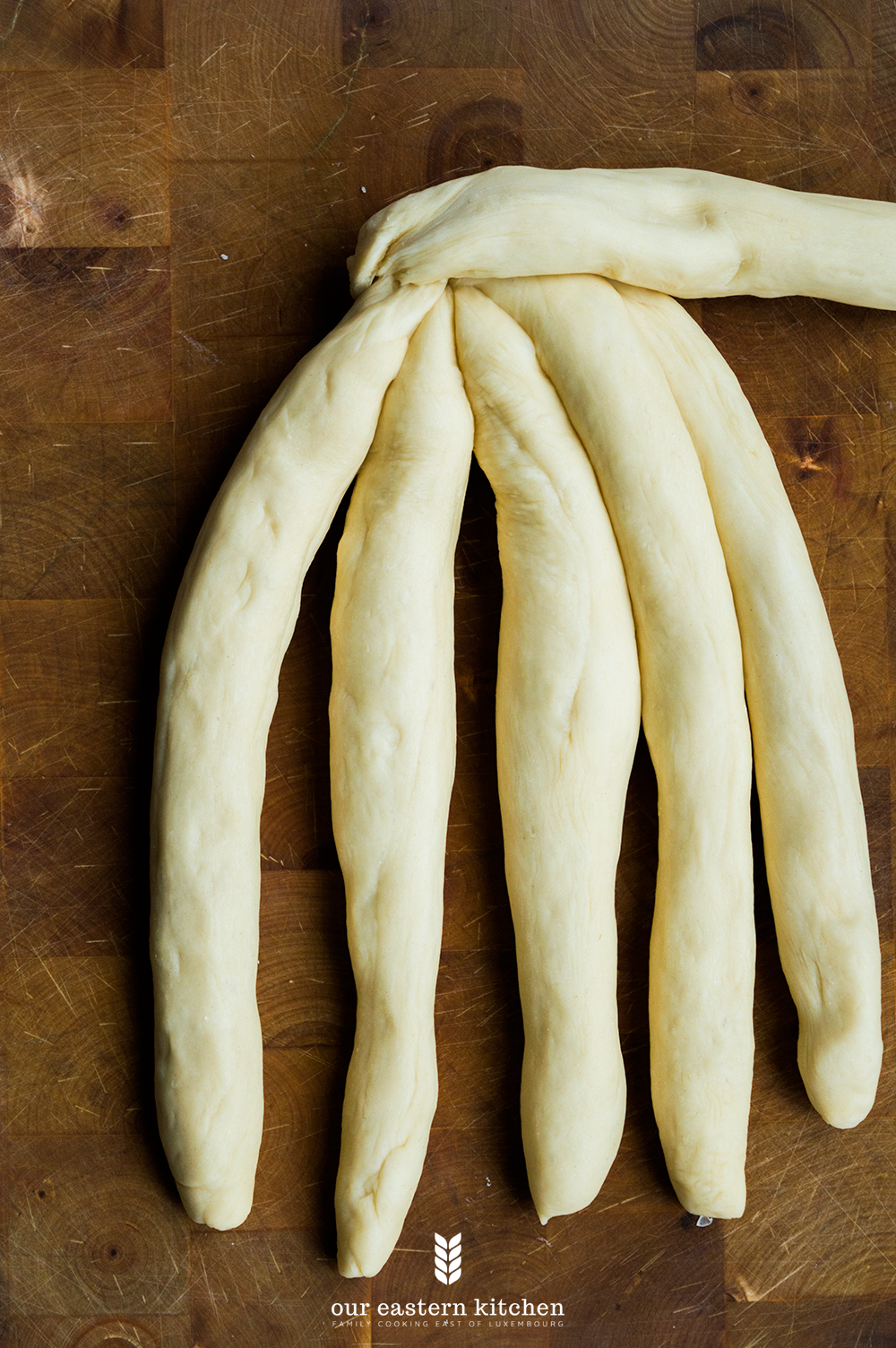 Lay the six strands side-by-side, then pinch all 6 tops together so they are connected at the top. Fold the pinched bit underneath, so the strands do not fall apart. Braid your challah slowly, closely following the directions above.