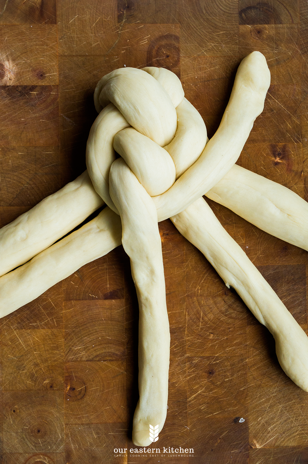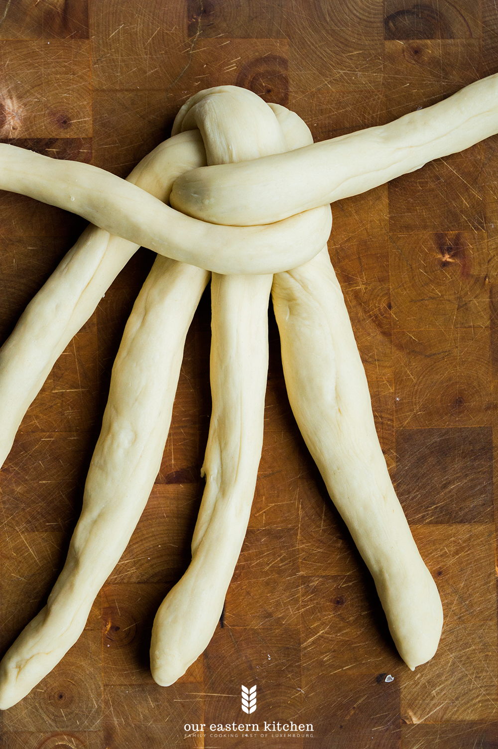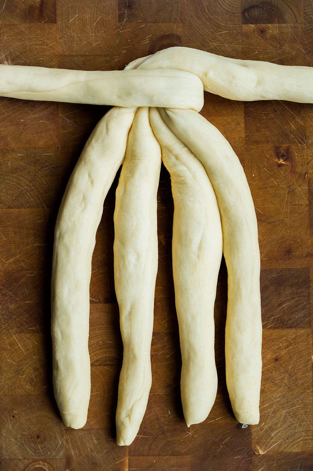Now notice the middle of your challah, which is in between strands 3 and 4.