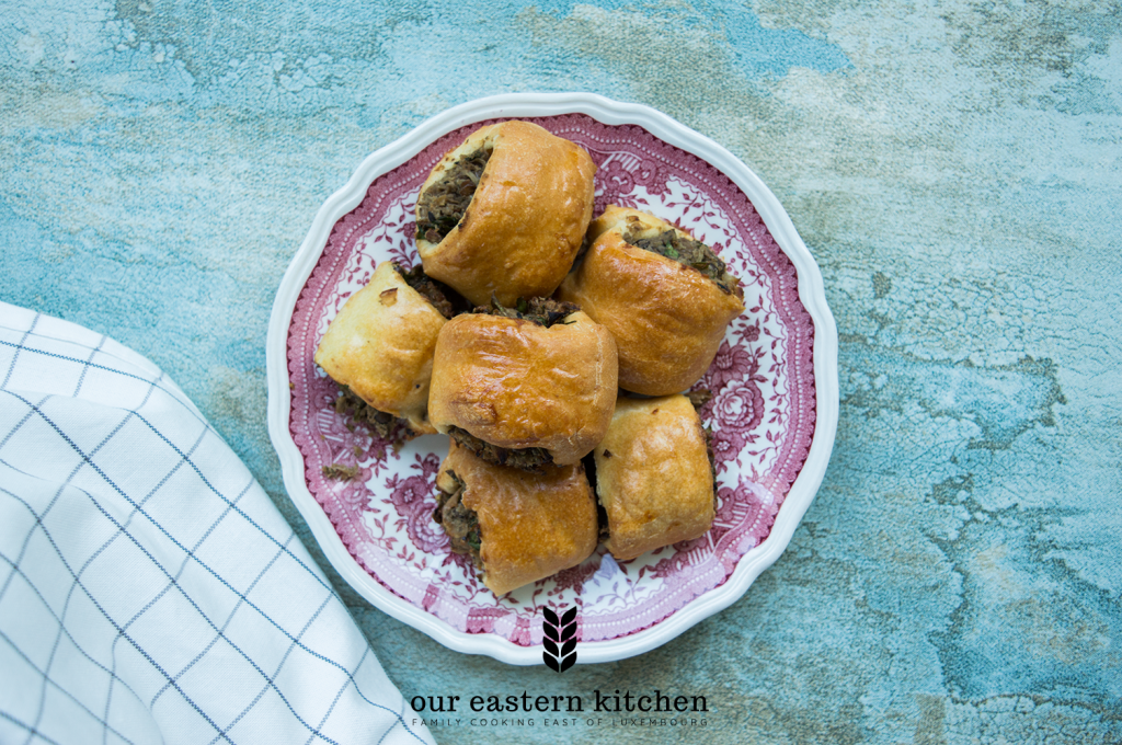 On a parchment paper, gently place all the pasties you can fit. Put them upright, rather than on their side, you need to brown them from the top. Let them proof one more time for about half an hour, then brush them with egg wash (I like making it with a dash of milk) and bake in 180ºC for about 30 minutes, until they are beautifully golden and slightly crispy.